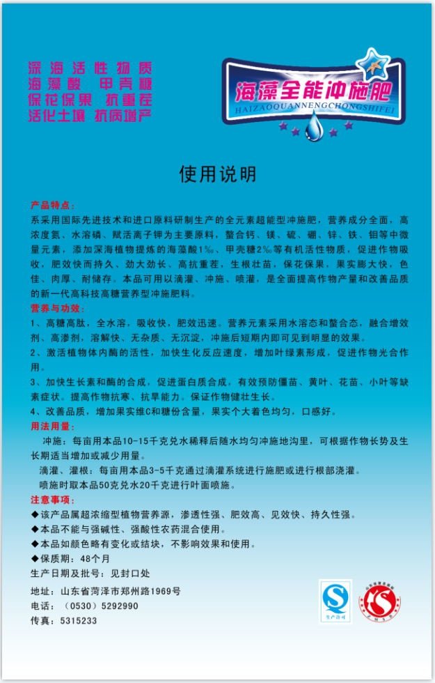 海藻全能 曹州 全水溶 大量元素 生根壮苗 花艳 叶绿 保花 保果 膨果 着色 增甜 叶面肥 滴灌肥 氮磷钾微量元素 果树蔬菜花卉