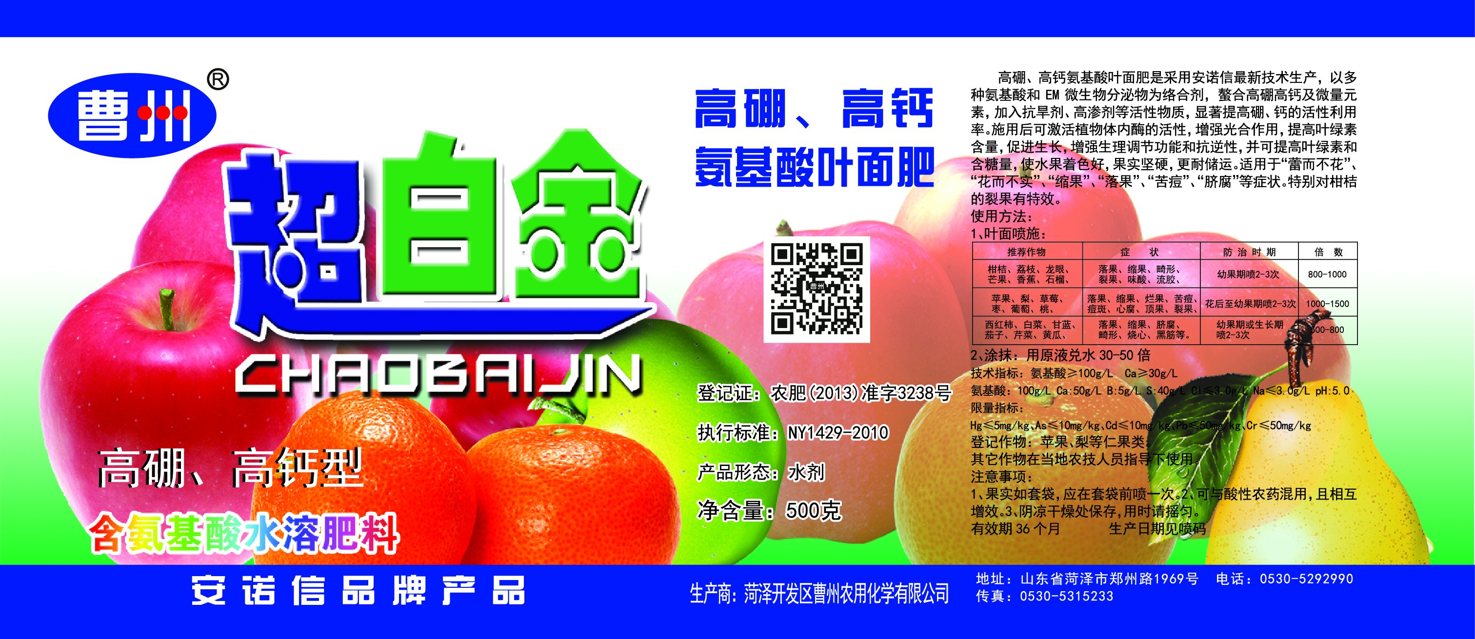 曹州 超白金 全水溶 高硼高钙 含氨基酸水溶肥料 叶面肥 水果着色好 果实坚硬 蔬菜果树大田通用 500g/瓶